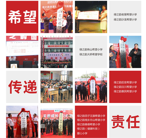 【具體內(nèi)容】:捐助38所綠之韻希望學(xué)校是所有綠之韻人的夙愿。全國(guó)各地已先后有綠之韻沙龍希望小學(xué)、綠之韻珠山希望小學(xué)、綠之韻大橋希望學(xué)校、綠之韻后官希望小學(xué)誕生、綠之韻汶川希望小學(xué)、綠之韻惠民希望小學(xué)、綠之韻四子王旗希望小學(xué)、綠之韻湘鄉(xiāng)月山希望學(xué)校、綠之韻(健康科技)涼山愛心小學(xué)等。2014年11月25日,綠之韻集團(tuán)獲共青團(tuán)中央、中國(guó)青少年發(fā)展基金會(huì)“希望工程25周年杰出貢獻(xiàn)獎(jiǎng)”。