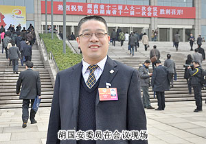 會(huì)議期間,省十一屆政協(xié)委員還集體列席了湖南省第十二屆人民代表大會(huì)第一次會(huì)議,會(huì)議由省委書記周強(qiáng)支持,省長徐守盛代表省人民政府作工作報(bào)告。報(bào)告圍繞經(jīng)濟(jì)發(fā)展、兩型社會(huì)建設(shè)、民生事業(yè)改善等內(nèi)容,對(duì)過去5年進(jìn)行回顧,并就如何推動(dòng)經(jīng)濟(jì)持續(xù)健康發(fā)展、建設(shè)天藍(lán)地綠水凈湖南、為民辦實(shí)事等做出重要部署。此次報(bào)告中有三個(gè)關(guān)鍵點(diǎn):一是加快推進(jìn)新型城鎮(zhèn)化,二是建設(shè)天藍(lán)地綠水凈湖南,三是以創(chuàng)業(yè)帶動(dòng)就業(yè)。值得關(guān)注的是,報(bào)告中提及的這三點(diǎn)與胡國安委員在擔(dān)任第十屆委員期間提交的提案《關(guān)于全力促進(jìn)我省縣域經(jīng)濟(jì)發(fā)展的建議》和本次提交的兩份提案形成了完美的契合、達(dá)到高度的一致。在擔(dān)任第十屆省政協(xié)委員的五年時(shí)間里,胡國安委員始終圍繞我省“四化兩型”戰(zhàn)略,圍繞人民群眾最關(guān)心最直接最現(xiàn)實(shí)的利益問題積極建言謀策,提交的提案《關(guān)于全力促進(jìn)我省縣域經(jīng)濟(jì)發(fā)展的建議》引起廣泛關(guān)注,被湖南衛(wèi)視、湖南經(jīng)視、《湘聲報(bào)》先后報(bào)道,并被評(píng)為“政協(xié)湖南省第十屆委員會(huì)優(yōu)秀委員”。此次,再次當(dāng)選省十一屆政協(xié)委員,胡國安委員經(jīng)過前期充分的考察調(diào)研,向大會(huì)組委會(huì)遞交了兩份提案《加強(qiáng)大氣污染防治工作,優(yōu)化我省環(huán)境質(zhì)量,大力推進(jìn)生態(tài)文明建設(shè)的建議和》、《提升全民創(chuàng)業(yè)質(zhì)量,建設(shè)創(chuàng)業(yè)創(chuàng)新型湖南的建議》,再次受到多家媒體的關(guān)注和與會(huì)委員的廣泛認(rèn)同。提案中,圍繞“生態(tài)湖南、綠色湖南”為出發(fā)點(diǎn),胡國安委員建議科學(xué)制定城市發(fā)展規(guī)劃,優(yōu)化城市區(qū)域功能和產(chǎn)業(yè)結(jié)構(gòu),著力打造瀏陽河生態(tài)風(fēng)光帶,把瀏陽河打造成湖南“賽納河”,加快建設(shè)天藍(lán)地綠水凈湖南。在民生事業(yè)改善方面,胡國安委員深入中小企業(yè)走訪調(diào)查,結(jié)合我省全民創(chuàng)業(yè)現(xiàn)狀,建議創(chuàng)造公平競爭的創(chuàng)業(yè)就業(yè)政策環(huán)境,鼓勵(lì)青年自主創(chuàng)業(yè),以創(chuàng)業(yè)帶動(dòng)就業(yè),大力發(fā)展實(shí)體經(jīng)濟(jì),拓寬融資渠道,建立完善的社會(huì)化服務(wù)體系,提高中小企業(yè)市場競爭力,全面提升我省全民創(chuàng)業(yè)質(zhì)量,促進(jìn)全省經(jīng)濟(jì)社會(huì)持續(xù)、健康發(fā)展。