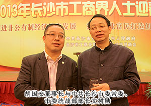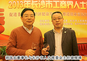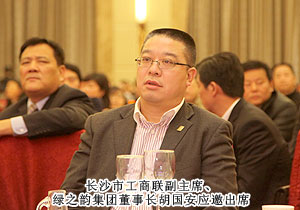 “話發(fā)展,謀未來,共迎新春佳節(jié)?!?013年1月23日,中共長沙市委、市政府舉行2013年長沙市工商界人士迎春酒會暨長沙市第四屆“優(yōu)秀中國特色社會主義事業(yè)建設者”頒獎典禮。來自全市各行各業(yè)的600多名工商界人士歡聚一堂,共議長沙發(fā)展大計。中共長沙市委副書記、市長張劍飛,中共長沙市委副書記張迎龍,長沙市人大常委會主任袁觀清等領導出席迎春酒會。長沙市工商聯(lián)副主席、第三屆優(yōu)秀中國特色社會主義事業(yè)建設者、綠之韻集團董事長胡國安主桌就座。