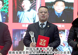 作為業(yè)界楷模的胡國(guó)安董事長(zhǎng),因其自身卓越的創(chuàng)業(yè)活動(dòng)和非凡的企業(yè)管理經(jīng)驗(yàn),以及頗受贊譽(yù)的社會(huì)聲望和影響力,獲評(píng)“2012年度湖南省最受職業(yè)經(jīng)理人尊敬的十大企業(yè)家”,省人大常委會(huì)副主任陳叔紅為胡國(guó)安董事長(zhǎng)授予獎(jiǎng)杯和榮譽(yù)證書。胡國(guó)安董事長(zhǎng)表示:“湖南經(jīng)濟(jì)的騰飛造就了一大批杰出企業(yè)家,如今,要將企業(yè)家個(gè)人的智慧內(nèi)化為企業(yè)的靈魂,就有賴于經(jīng)理人制度的發(fā)展和完善。綠之韻集團(tuán)無(wú)論在制度設(shè)計(jì)上還是管理上,都注重對(duì)職業(yè)經(jīng)理人、對(duì)人才的長(zhǎng)期培養(yǎng),一批批優(yōu)秀的專業(yè)人才在綠之韻迅速崛起,使企業(yè)運(yùn)作更加職業(yè)化和市場(chǎng)化。綠之韻的成功不僅在于做大做強(qiáng)了企業(yè),更重要的是能培養(yǎng)一支忠誠(chéng)感強(qiáng)、能夠不斷創(chuàng)造高績(jī)效的職業(yè)經(jīng)理人隊(duì)伍?!?br/>