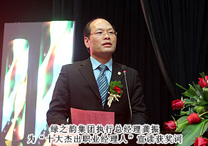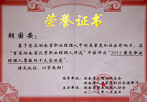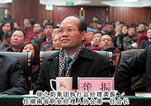 隨著商業(yè)社會(huì)的發(fā)展,職業(yè)經(jīng)理人正引領(lǐng)著未來(lái)的職業(yè)力量。在湖南,職業(yè)經(jīng)理人的迅速成長(zhǎng),已塑造出湖南全新的商業(yè)力量。2013年1月5日,2012湖南省職業(yè)經(jīng)理人大會(huì)暨湖南首屆優(yōu)秀職業(yè)經(jīng)理人評(píng)選頒獎(jiǎng)典禮在長(zhǎng)沙舉行,綠之韻集團(tuán)董事長(zhǎng)胡國(guó)安獲評(píng)2012年度湖南省最受職業(yè)經(jīng)理人尊敬的十大企業(yè)家,綠之韻集團(tuán)執(zhí)行總經(jīng)理龔振作為湖南省職業(yè)經(jīng)理人協(xié)會(huì)首任會(huì)長(zhǎng)出席會(huì)議。