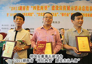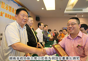 綠之韻集團(tuán)作為湖南省非公有制經(jīng)濟(jì)黨建工作優(yōu)秀典型企業(yè),憑借在積極引導(dǎo)非公經(jīng)濟(jì)融入“四化兩型”戰(zhàn)略方面取得的杰出貢獻(xiàn),經(jīng)各地、各部門(mén)和相關(guān)單位的積極推薦、評(píng)審,并經(jīng)《湖南日?qǐng)?bào)》公示,董事長(zhǎng)胡國(guó)安被評(píng)為2011湖南省‘四化兩型’建設(shè)杰出人物。2011年兩會(huì)期間,湖南省優(yōu)秀政協(xié)委員胡國(guó)安在會(huì)議上作《積極引導(dǎo)非公有制經(jīng)濟(jì)融入“四化兩型”戰(zhàn)略的建議》的報(bào)告,該提案獲得中共湖南省委書(shū)記、省人大常委會(huì)主任周強(qiáng)的重要批示,被納為省經(jīng)信委重要研究課題。