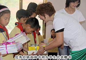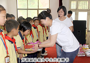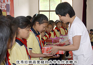 綠之韻集團董事常務(wù)副總裁勞嘉、黨支部書記許達仲、慈善基金負責人蔣文,湖南地區(qū)優(yōu)秀經(jīng)銷商代表周書明、羅新春、夏曉玲等出席捐贈儀式,用精美的圖書為孩子們打開知識世界的一扇窗。