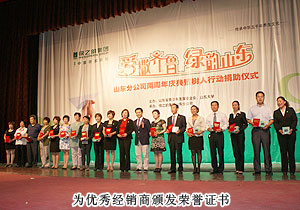 綠之韻執(zhí)行總經(jīng)理龔振發(fā)表致辭,代表綠之韻集團(tuán)對(duì)山東分公司兩周年慶典表示衷心祝賀,感謝對(duì)多年來(lái)山東地區(qū)綠之韻伙伴與山東分公司風(fēng)雨同舟、和衷共濟(jì),并將5萬(wàn)元愛心款物捐贈(zèng)給山東省青少年發(fā)展基金會(huì)副秘書長(zhǎng)姜大鵬。姜秘書長(zhǎng)也回贈(zèng)綠之韻集團(tuán)希望工程捐助牌匾,同時(shí)向綠之韻愛心經(jīng)銷商頒發(fā)了象征慈善與愛心的捐助證書。10位獲資助的大學(xué)生深深鞠躬表達(dá)心中的感謝,一曲感恩的心使整個(gè)會(huì)場(chǎng)籠罩了一層愛的光芒。