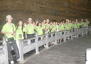 “世界溶洞全能冠軍”黃龍洞是此次張家界之旅的第一站,七月炎炎夏日,黃龍洞自然空調(diào)帶來(lái)的清涼是送給伙伴們的第一份禮物。從狹小的通道走進(jìn)去,一個(gè)繽紛神秘的世界讓所有伙伴驚嘆不已。立體的洞穴結(jié)構(gòu),超過(guò)10萬(wàn)平方米的龐大的洞穴空間,寬闊的龍宮廳及數(shù)以萬(wàn)計(jì)的石筍,高大的洞穴瀑布,讓黃龍洞蜚聲海外。洞內(nèi)有1庫(kù)、2河、3潭、4瀑、13大廳、98廊,以及幾十座山峰,上千個(gè)白玉池和近萬(wàn)根石筍。由石灰質(zhì)溶液凝結(jié)而成的石鐘乳、石筍、石柱、石花、石幔、石枝、石管、石珍珠、石珊瑚等遍布其中,無(wú)所不奇,無(wú)奇不有,仿佛一座神奇的地下“魔宮”?;锇閭兇┧笤邶埼鑿d、響水河、天仙瀑、天柱街、龍宮等六大游覽區(qū),欣賞定海神針、萬(wàn)年雪松、龍王寶座、火箭升空、花果山、天仙瀑布等100多個(gè)景點(diǎn),深深陶醉在大自然神奇的懷抱里。