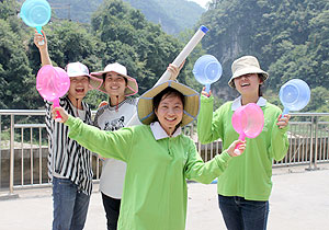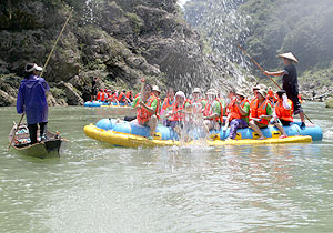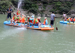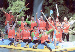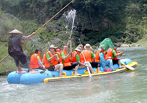 在胡國(guó)安董事長(zhǎng)的率領(lǐng)下,伙伴們浩浩蕩蕩前往素有“天下第一漂”美譽(yù)的猛洞河漂流。大家搶購(gòu)著水槍、水瓢、雨衣等打水仗的武器,懷著渴望刺激挑戰(zhàn)驚險(xiǎn)的心情互相挑釁,只見(jiàn)河中水花飛舞、水柱橫飛,還未等上船伙伴們就紛紛“濕身”了。拐一百五十五個(gè)彎,在一百三十三個(gè)灘潭中穿梭而行,兩岸怪石嶙峋,野猴出沒(méi),飛瀑激流,山與水的組合,讓許多來(lái)自北方的營(yíng)銷精英大呼過(guò)癮。來(lái)自葫蘆島的65歲的韓秀芝老太,端著水槍,握著水瓢,與伙伴們暢快淋漓地酣戰(zhàn),她說(shuō):真是太過(guò)癮了,人生難得有幾回這樣的機(jī)會(huì),我一定要帶領(lǐng)更多的伙伴來(lái)挑戰(zhàn)猛洞河!