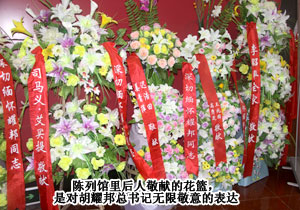 在偉大的無(wú)產(chǎn)階級(jí)革命家、政治家,原中國(guó)共產(chǎn)黨中央委員會(huì)總書(shū)記胡耀邦故居陳列館里,擺放著大大小小的花籃,那是后人對(duì)胡耀邦總書(shū)記一生“一身正氣,兩袖清風(fēng)”無(wú)限敬意的表達(dá)。中共中央政治局委員、十一屆全國(guó)人大常委會(huì)副委員長(zhǎng)、中華全國(guó)總工會(huì)主席王兆國(guó),原中華人民共和國(guó)中央軍事委員會(huì)副主席,國(guó)務(wù)委員兼國(guó)防部部長(zhǎng)遲浩田、中共湖南省委書(shū)記、省人大常委會(huì)主任周強(qiáng)等領(lǐng)導(dǎo)先后敬獻(xiàn)花籃。胡國(guó)安董事長(zhǎng)也滿(mǎn)懷對(duì)偉大革命家的尊敬之情敬獻(xiàn)花籃,深切緬懷胡耀邦總書(shū)記。