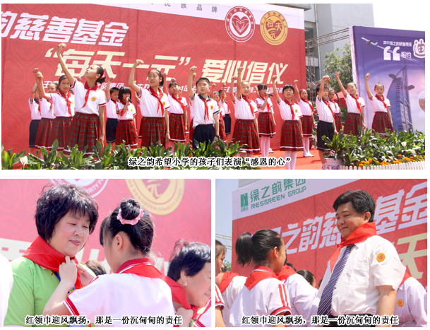 在“每天一元”慈善倡議活動現(xiàn)場,共青團(tuán)長沙市委副書記詹萍萍為胡國安董事長頒發(fā)長沙市青少年發(fā)展基金會理事牌匾,并發(fā)表講話,充分肯定了綠之韻集團(tuán)在發(fā)展企業(yè)的同時積極開展各類公益慈善活動的善舉。綠之韻集團(tuán)董事常務(wù)副總裁勞嘉就今年山東和內(nèi)蒙古兩所希望小學(xué)向長沙市青少年發(fā)展基金會理事長羊舒麟遞交希望工程捐贈支票,羊舒麟理事長代表長沙市青少年發(fā)展基金會為綠之韻集團(tuán)頒發(fā)希望工程貢獻(xiàn)單位獎牌匾?,F(xiàn)場,由綠之韻老屋希望小學(xué)的學(xué)生現(xiàn)場表演的手語歌舞《感恩的心》將現(xiàn)場氣氛推向高潮,希望小學(xué)的孩子們?yōu)樯綎|和內(nèi)蒙古兩地愛心經(jīng)銷商上臺佩戴紅領(lǐng)巾,愛心大使們給學(xué)生贈送精美的文具,愛心的芬芳充溢現(xiàn)場。綠之韻重教樂捐愛心代表申文高、王連坤現(xiàn)場進(jìn)行了“感恩事業(yè) 回報社會”的分享,贏得現(xiàn)場陣陣充滿敬意的掌聲。