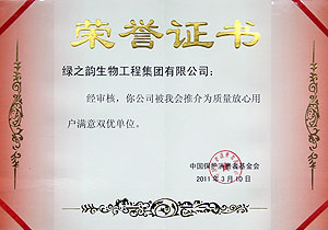 2011年“3?15”國(guó)際保護(hù)消費(fèi)者權(quán)益日之際,中國(guó)保護(hù)消費(fèi)者基金會(huì)根據(jù)《消費(fèi)者權(quán)益保護(hù)法》所賦予的職能和職責(zé),以“誠(chéng)信、維權(quán)”為年度消費(fèi)主題而組織的“全國(guó)市場(chǎng)放心消費(fèi)單位”評(píng)比活動(dòng)揭榜。綠之韻集團(tuán)認(rèn)真貫徹執(zhí)行《消費(fèi)者權(quán)益保護(hù)法》、《產(chǎn)品質(zhì)量法》,嚴(yán)格按照國(guó)家的行業(yè)規(guī)定與質(zhì)量標(biāo)準(zhǔn)組織生產(chǎn),經(jīng)過(guò)活動(dòng)組織方及國(guó)家相關(guān)部門(mén)的層層審查,被中國(guó)保護(hù)消費(fèi)者基金會(huì)授予“全國(guó)市場(chǎng)放心消費(fèi)單位”。