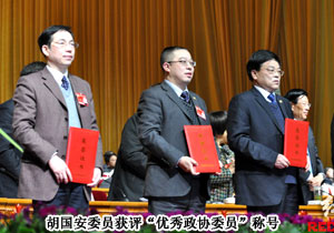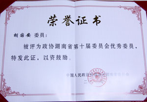 根據(jù)《關于湖南省政協(xié)委員履行職責的辦法(試行)》“在每一屆政協(xié)的第三、第五年,按照委員總數(shù)的8%評選優(yōu)秀政協(xié)委員”的要求,省政協(xié)將在年底評選優(yōu)秀省政協(xié)委員。優(yōu)秀省政協(xié)委員評選條件為:積極主動參加政協(xié)活動,并在其中起骨干作用;履行職責成果顯著,建言獻策轉(zhuǎn)化率高;為地方經(jīng)濟社會發(fā)展作出的貢獻較大。評選采取量化的辦法,依據(jù)政協(xié)職能和委員職責,設置了參加政協(xié)例會情況、撰寫提案及辦理情況、社情民意采用及轉(zhuǎn)化情況、參加調(diào)研情況等9個計分項目。擔任政協(xié)委員期間,胡國安委員先后提交了《我省民企應對金融危機的對策及建議》《關于下調(diào)武廣高鐵票價》等多份關系經(jīng)濟發(fā)展及社會民生的提案,并多次深入一線調(diào)研,實實在在了解民眾,及時提出建議,最終獲評“優(yōu)秀政協(xié)委員”榮譽稱號。湖南衛(wèi)視、湖南經(jīng)視、紅網(wǎng)、《瀟湘晨報》《長沙晚報》《人民政協(xié)報》等多家權威媒體對胡國安委員的先進事跡進行了報道!