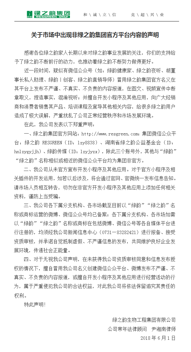 鄭重聲明(關(guān)于市場中出現(xiàn)非綠之韻集團(tuán)官方平臺內(nèi)容的聲明)