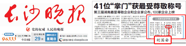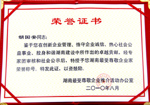 2010年8月28日,由湖南省科技廳、湖南省國家稅務局、湖南企業(yè)發(fā)展調研辦公室、湖南發(fā)展研究中心等單位聯(lián)合舉辦的"第三屆湖南最受尊敬企業(yè)推介"頒獎盛典暨新聞通報會在湖南蓉園賓館舉行。湖南省人大常委會黨組成員、省政府顧問唐之享、原湖南省委書記熊清泉、原湖南省政協(xié)主席劉夫生等老領導出席本次頒獎活動?!逗先請蟆?、《瀟湘晨報》、紅網、長沙新聞頻道等多家媒體對本次評選給予高度關注。綠之韻集團榮獲“湖南最受尊敬企業(yè)”榮譽稱號,胡國安董事長被授予“湖南最受尊敬企業(yè)家”榮譽稱號。