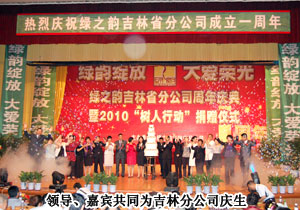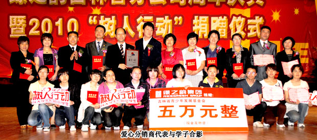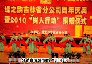 2010年5月29日,綠之韻吉林分公司喜迎“綠韻綻放?大愛榮光”一周年慶典暨“綠之韻樹人行動(dòng)”捐贈(zèng)儀式。綠之韻集團(tuán)執(zhí)行總經(jīng)理龔振、吉林分公司經(jīng)理劉曉桅與1000多名分銷精英共同為吉林分公司點(diǎn)亮生日蠟燭,歡樂慶生!同時(shí),吉林省青少年發(fā)展基金會(huì)部長(zhǎng)王超與東北師范大學(xué)10名品學(xué)兼優(yōu)的貧困學(xué)子列席會(huì)議,接受吉林分公司10名愛心分銷商5萬元人民幣的愛心捐贈(zèng)。