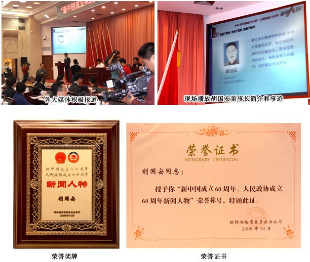 湖南省政協(xié)委員、綠之韻集團(tuán)董事長胡國安被評選為“新中國成立60周年人民政協(xié)成立60周年新聞人物”,充分肯定了綠之韻集團(tuán)和胡國安董事長在發(fā)展事業(yè)的同時(shí),為社會進(jìn)步所做的貢獻(xiàn),為經(jīng)濟(jì)發(fā)展所做出的重要成績。胡國安董事長因在國外學(xué)習(xí)而未能趕到現(xiàn)場,綠之韻集團(tuán)董事長助理馬艷代表胡國安董事長出席現(xiàn)場領(lǐng)獎(jiǎng)。胡國安董事長表示,綠之韻集團(tuán)將以更成熟穩(wěn)健的步伐邁向更寬廣的發(fā)展之路,以更強(qiáng)的責(zé)任感去擔(dān)當(dāng)社會發(fā)展中的使命。同時(shí)獲此殊榮的還有 “雜交水稻之父”袁隆平;中國工程院院士、湖南大學(xué)校長鐘志華等。
