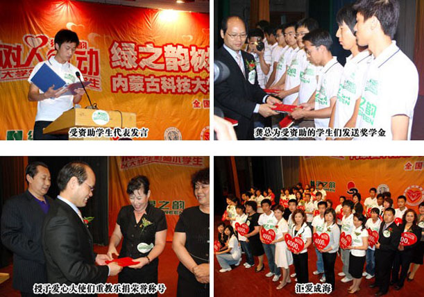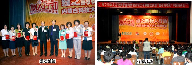 2009年5月24日晚上19時30分,內(nèi)蒙古科技大學禮堂內(nèi)座無虛席,由綠之韻慈善基金聯(lián)合內(nèi)蒙古青少年基金會、內(nèi)蒙古科技大學主辦的綠之韻樹人行動全國第二站捐贈儀式暨責任與夢想的專題報告會在這里隆重舉行。