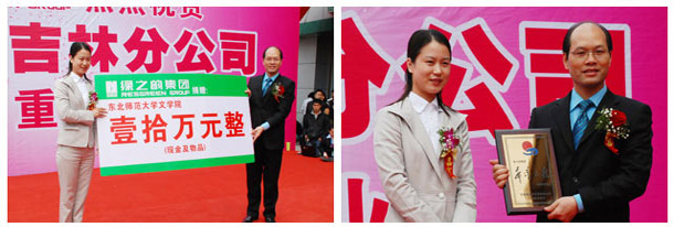 在綠之韻集團(tuán)吉林分公司開業(yè)慶典現(xiàn)場(chǎng),十名手持愛心捐贈(zèng)牌匾的大學(xué)生十分引人注目,他們是由吉林省青少年發(fā)展基金會(huì)甄選出來的品學(xué)兼優(yōu)但家境貧困的大學(xué)生、“綠之韻樹人行動(dòng)”首批資助對(duì)象十名——八名東北師范大學(xué)的貧困大學(xué)生以及兩名綠之韻吉林分銷商子弟。綠之韻慈善基金預(yù)計(jì)總投資一千萬開展的“綠之韻樹人行動(dòng)”已正式啟動(dòng),這也意味著綠之韻集團(tuán)一直秉承的“關(guān)愛生命、造福人類” 的理念、助人為樂的精神再一次得到實(shí)現(xiàn)及升華。