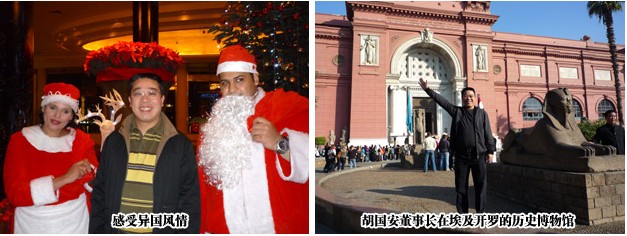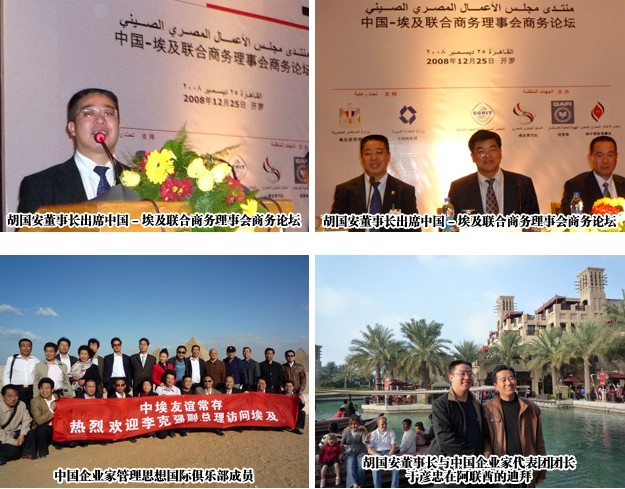 中國企業(yè)家管理思想國際俱樂部代表團(tuán),在團(tuán)長于彥忠秘書長的率領(lǐng)下,經(jīng)過六天,行程2萬余公里,圓滿結(jié)束了對埃及和阿聯(lián)酋的訪問,于2008年12月28日晚11點(diǎn)回到北京。開羅是埃及的首都,近年來經(jīng)濟(jì)發(fā)展迅速,蘊(yùn)藏著無限商機(jī)。在此次的中埃聯(lián)合商務(wù)理事論壇上,胡國安與埃方洽談綠之韻在埃及的合作項(xiàng)目。
