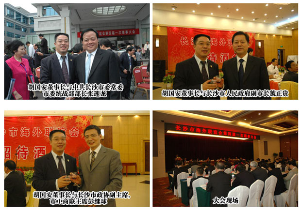 2008年10月23日上午9時(shí)整,長沙市海外聯(lián)誼會(huì)第四屆一次理事大會(huì)在楓林賓館隆重舉行,來自全國包括香港、澳門、臺(tái)灣以及海內(nèi)外華商華僑在內(nèi)的283名理事出席了會(huì)議。湖南省委常委、長沙市委書記陳潤兒,湖南省委統(tǒng)戰(zhàn)部副部長蔡建和到會(huì)祝賀并發(fā)表講話,幾十個(gè)國家和地區(qū)的海外聯(lián)誼會(huì)、商會(huì)發(fā)來賀電。