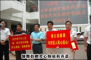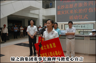 2008年5月26日,,“川湘情一家親 ”長沙志愿者服務(wù)四川地震災(zāi)區(qū)來長沙治療病員活動(dòng)儀式在長沙市中心醫(yī)院舉行,綠之韻集團(tuán)董事長助理、綠之韻慈善基金秘書長馬艷代表集團(tuán)公司出席了活動(dòng)。