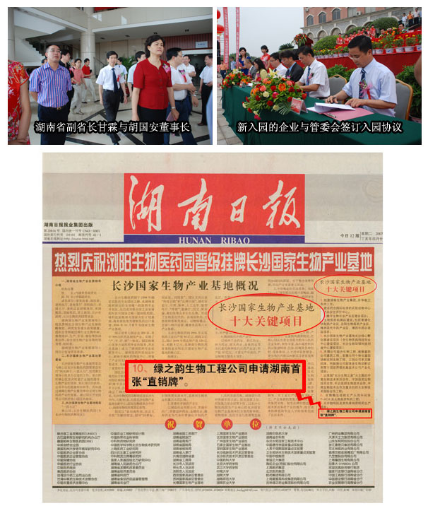 2007年6月12日上午九點(diǎn),綠之韻集團(tuán)國內(nèi)事業(yè)總部所在地瀏陽生物醫(yī)藥園舉行了晉級(jí)長沙國家生物產(chǎn)業(yè)基地授牌儀式。國家發(fā)改委副主任張曉強(qiáng)、湖南省人民政府常務(wù)副省長肖捷、湖南省副省長甘霖、長沙市副市長劉曉明等領(lǐng)導(dǎo)出席儀式并講話。綠之韻集團(tuán)董事長兼總裁胡國安先生、董事常務(wù)副總經(jīng)理勞嘉女士作為園區(qū)重點(diǎn)企業(yè)代表也受邀出席了儀式。