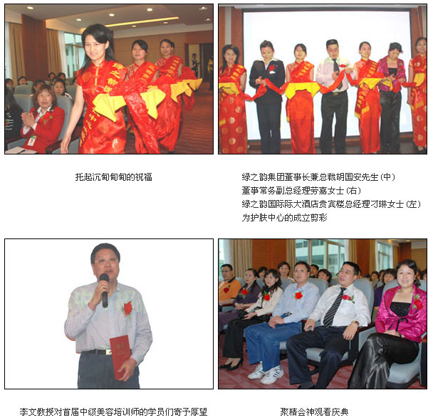 2007年4月22日,綠之韻集團(tuán)公司三喜臨門,綠之韻國(guó)際會(huì)議中心掛牌運(yùn)營(yíng)、綠之韻法國(guó)蘭茜貴族美容護(hù)膚中心正式成立暨首屆中級(jí)美容培訓(xùn)班開學(xué)慶典同時(shí)在集團(tuán)公司國(guó)際會(huì)議中心二樓隆重舉行。綠之韻集團(tuán)董事長(zhǎng)兼總裁胡國(guó)安先生、常務(wù)副總經(jīng)理勞嘉女士、綠之韻國(guó)際大酒店貴賓樓總經(jīng)理刁琳女士、美容中心主任楊穎女士、培訓(xùn)班講師李文、薛麗君老師,還有曹鳳華、谷方彤、韓曉鳴等系統(tǒng)領(lǐng)導(dǎo)人分別組織其系統(tǒng)精英及首屆中級(jí)美容師培訓(xùn)班的50余名學(xué)員參加了此次慶典活動(dòng)。