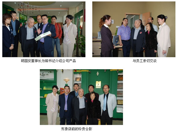 2007年4月15日,原湖南省委書記熊清泉攜其夫人蒞臨綠之韻集團考察指導工作?!吧菩?007、三湘助學行”香港明星足球隊(長沙)大型公益義演賽組委會總顧問、綠之韻集團董事長兼總裁胡國安先生,綠之韻集團董事、執(zhí)行總經(jīng)理陳社行先生,董事、常務(wù)副總經(jīng)理勞嘉女士,綠之韻國際集團(東南亞)股份有限公司執(zhí)行總經(jīng)理龔振先生對老書記的到來表示了最熱烈的歡迎。并親自陪同老領(lǐng)導進行了詳細實察。