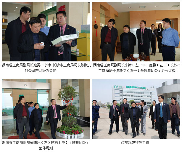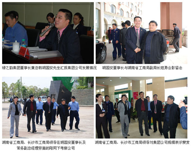 2007年4月11日,湖南省工商局副局長(zhǎng)寇勇、李沐,長(zhǎng)沙市工商局局長(zhǎng)陳躍文等帶領(lǐng)省、市工商局市場(chǎng)處、外資處、商標(biāo)廣告監(jiān)督管理處、注冊(cè)局等40余名領(lǐng)導(dǎo)深入湖南瀏陽(yáng)生物醫(yī)藥園,對(duì)公司進(jìn)行了調(diào)研考察。省、市工商局調(diào)研組一行首先在瀏陽(yáng)生物醫(yī)藥園管委會(huì)政務(wù)廳聽取了瀏陽(yáng)工商局、管委會(huì)領(lǐng)導(dǎo)以及綠之韻集團(tuán)董事長(zhǎng)兼總裁胡國(guó)安先生的工作匯報(bào)。
