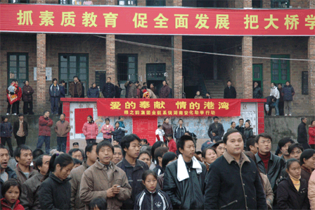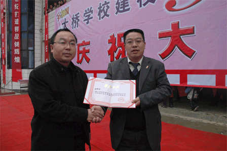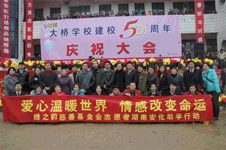 胡國安董事長代表綠之韻集團(tuán)出資十萬元捐助了第四所綠之韻大橋希望中學(xué),這也是綠之韻集團(tuán)公司繼2006年5月28日在黑龍江省佳木斯市捐助了第三所綠之韻珠山希望小學(xué)后的又一次慈善義舉。本次捐贈(zèng)得到了當(dāng)?shù)馗咐相l(xiāng)親擁護(hù)的同時(shí)也得到湖南安化縣政府和教育局的高度贊譽(yù),并授予胡國安集董事長為湖南安化冷市鎮(zhèn)大橋?qū)W?!皹s譽(yù)校長”、安化縣“榮譽(yù)市民”的稱號(hào)。綠之韻優(yōu)秀經(jīng)銷商柳紅先、張吉福夫婦、李平、谷方彤、韓曉鳴以及綠之韻金航系統(tǒng)的部分代表作為綠之韻慈善基金會(huì)志愿者參加了此次活動(dòng)。曹鳳華、柳紅先、張吉福夫婦、李平、谷方彤、廉淇夫婦、王愛麗、浦守仁夫婦、韓曉鳴、呂艷玲等人慷慨解囊,為大橋中學(xué)捐款,紛紛被安化縣政府授予“榮譽(yù)市民”稱號(hào)和大橋?qū)W校“愛心使者”的稱號(hào)。