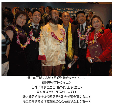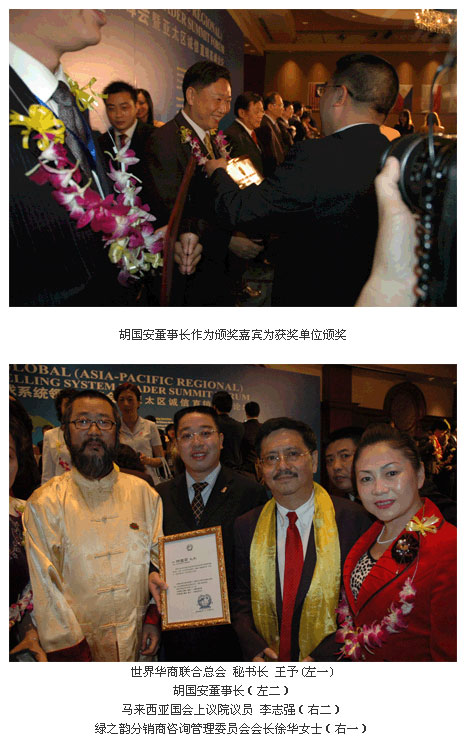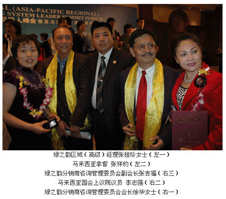 此次風(fēng)云聚會,綠之韻集團(tuán)憑借其三年多來在業(yè)界的出色表現(xiàn)及在直銷法規(guī)框架內(nèi)銳意創(chuàng)新的特色營銷模式,榮獲第三屆環(huán)球系統(tǒng)領(lǐng)導(dǎo)人峰會暨亞太區(qū)誠信高峰論壇“2006亞太區(qū)10佳創(chuàng)新營銷模式范例企業(yè)”大獎。集團(tuán)公司董事長兼總裁胡國安先生不但作為此次峰會的特約嘉賓為獲得“2006亞太區(qū)最具品牌競爭力十佳保健品”稱號的代表頒獎,更因其在推動和諧社會健康發(fā)展系列事業(yè)及活動中的卓越表現(xiàn),被世界和諧促進(jìn)會授予“世界和諧文化使者稱號”稱號。在獲獎感言中胡國安董事長表示:推動和諧社會發(fā)展是綠之韻公司永遠(yuǎn)的事業(yè),“共祈世界和諧進(jìn)步,同助人類健康幸福”也將是綠之韻公司的永恒追求,不但是自己,所有綠之韻精英都將會為“實現(xiàn)人類同一愿望——共鑄和諧社會,共同承載人類同一責(zé)任——同創(chuàng)世界和平”事業(yè)繼續(xù)努力。