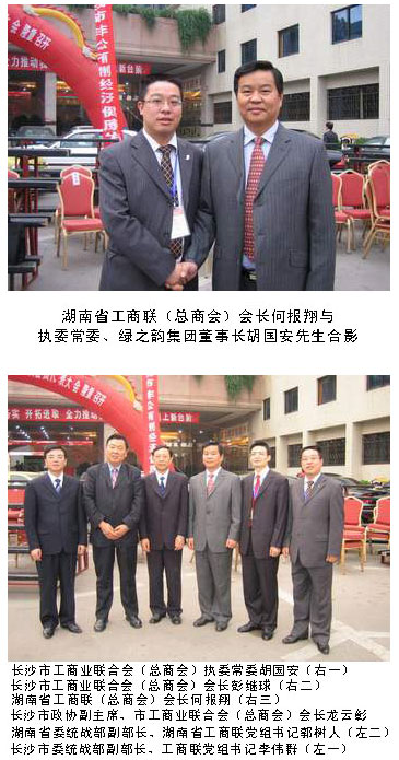 2006年11月15—16日,綠之韻國際集團董事長兼總裁胡國安先生參加了長沙工商聯(lián)、非公有制經(jīng)濟界五年一次的盛會——長沙市工商業(yè)聯(lián)合會(總商會)第十二次會員代表大會。中共湖南省委副書記、長沙市委書記梅克保、湖南省委統(tǒng)戰(zhàn)部副部長、湖南省工商聯(lián)黨組書記郭樹人、湖南省工商聯(lián)(總商會)會長何報翔、中共長沙市委副書記吳志雄、長沙市人民政府常務(wù)副市長向力力、長沙市政協(xié)副主席、長沙市工商業(yè)聯(lián)合會(總商會)會長龍云彰、長沙市委統(tǒng)戰(zhàn)部副部長、工商聯(lián)黨組書記李偉群、長沙市工商業(yè)聯(lián)合會(總商會)會長彭繼球、長沙市政協(xié)副主席、工商聯(lián)(總商會)副會長龔振湘等領(lǐng)導(dǎo)出席了本次會議并發(fā)表精彩講話。