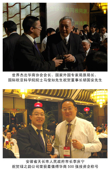 本屆評(píng)選得到了國家領(lǐng)導(dǎo)人的高度重視,世界華商協(xié)會(huì)主席第九屆全國政協(xié)副主席孫孚凌擔(dān)任大會(huì)主席、全國人大常委會(huì)副委員長何魯麗擔(dān)任第二屆世界杰出華商大會(huì)主席,全國人大常委員會(huì)副委員長顧秀蓮、全國政協(xié)副主席阿不來提﹒阿不都熱西提等國家領(lǐng)導(dǎo)人出席了大會(huì)開幕式;當(dāng)天世界杰出華商協(xié)會(huì)主席第九屆全國政協(xié)副主席孫孚林、世界杰出華商協(xié)會(huì)會(huì)長、國家外國專家局原局長、國際歐亞科學(xué)院院士馬俊如等國家相關(guān)領(lǐng)導(dǎo)人在北京釣魚臺(tái)國賓館與優(yōu)秀的企業(yè)領(lǐng)導(dǎo)人以最高級(jí)別的慶祝晚宴為本屆獲獎(jiǎng)企業(yè)表示祝賀。國家領(lǐng)導(dǎo)人親切的接見了香港綠之韻國際集團(tuán)董事長胡國安先生。對(duì)綠之韻公司傳承五千年養(yǎng)生文化的經(jīng)營理念和構(gòu)筑百年民族品牌的發(fā)展目標(biāo)給于了高度的贊賞和肯定。