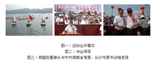 仲秋喜盼豐收日,盛世歡慶國慶時。2006年9月22日上午,由長沙市市委、長沙市人民政府主辦,綠之韻公司出資協(xié)辦的“長沙市第一屆農(nóng)民運動會龍舟賽”在風(fēng)光秀美的瀏陽赤馬湖隆重開幕。湖南省常委、長沙市委書記梅克保、長沙市委巡視員、市人大黨組第一副書記余合泉、長沙市市委副書記吳志雄、長沙市市委秘書長張湘濤、長沙市人大副主任劉耀杰、長沙市人民政府副市長曹亞、長沙市政協(xié)副主席柳冠群、市政協(xié)副主席姚五零、瀏陽市委書記易佳良、綠之韻集團(tuán)董事長兼總裁胡國安先生與省市領(lǐng)導(dǎo)共同出席了第一屆農(nóng)民運動會開幕式。