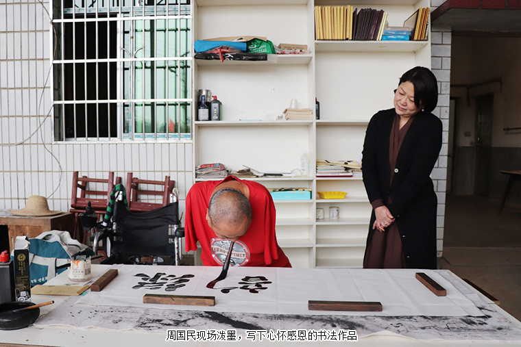 離開前,周國民在勞嘉理事長幫助下?lián)]毫潑墨,寫下了《綠韻大愛》的書法作品。揮灑的汗水、真誠的笑容、動人的身影就如這秋日暖陽,在寒冷季節(jié)到來之前尤為珍貴。我們希望,命運(yùn)奪走了他的部分軀體,愛讓他的人生不再殘缺。