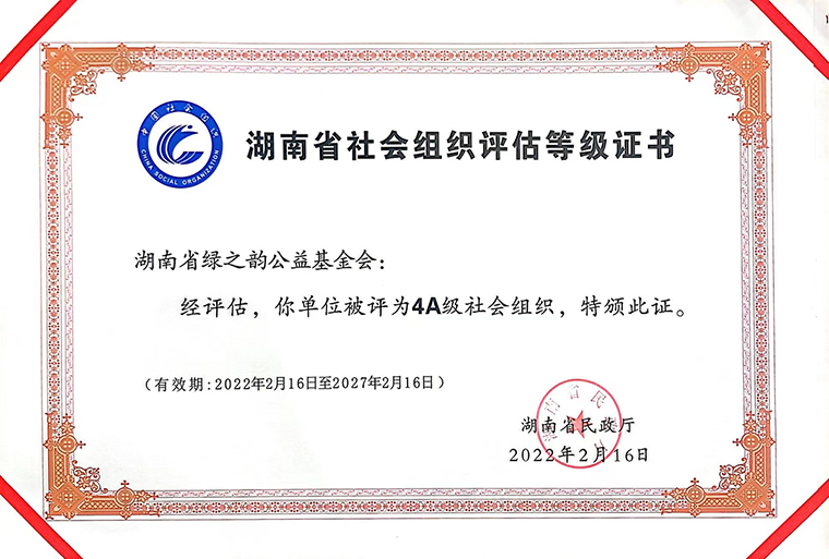 2022年3月9日,湖南省社會組織等級評估授牌大會在長沙召開。根據(jù)民政部《社會組織評估管理辦法》、《湖南省社會組織評估管理辦法》有關(guān)規(guī)定,社會組織等級評估從基礎(chǔ)條件、內(nèi)部治理、工作績效、黨建工作和社會評價五個方面對申報單位進(jìn)行綜合考評,經(jīng)專家組實地考察、現(xiàn)場交流、意見反饋、資料核查、網(wǎng)上公示等程序,最終確定評估等級。湖南省綠之韻公益基金會獲評“4A級社會組織”。