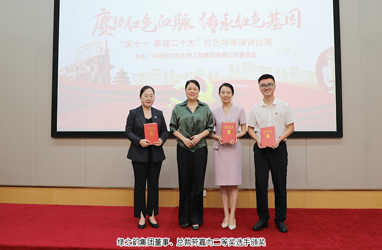 比賽結(jié)束,綠之韻集團(tuán)黨委組織委員楊丹宣讀比賽結(jié)果。隨后,與會領(lǐng)導(dǎo)為獲獎(jiǎng)選手頒獎(jiǎng)。瀏陽經(jīng)開區(qū)(高新區(qū))黨工委委員、管委會副主任何六生在講話中表示,每一個(gè)紅色故事,都是一場生動的黨課,聆聽了所有選手的深情演講,收獲許多也學(xué)習(xí)到許多。他向今天獲得表彰的選手表示祝賀,向在場的所有黨員送上“七一”生日祝福,并祝愿綠之韻的明天更加美好。綠之韻集團(tuán)黨委書記劉云表示,感謝公司領(lǐng)導(dǎo)對此次活動的支持重視與熱情參與,大家的肯定與支持是推進(jìn)集團(tuán)黨建工作的力量源泉。她對今天參加比賽的所有選手給予了肯定和鼓勵(lì)。她希望,在集團(tuán)公司黨委的帶領(lǐng)下,所有黨員能把弘揚(yáng)革命傳統(tǒng),傳承紅色基因融入到企業(yè)發(fā)展的全過程,匯聚綠之韻最大“同心圓”,不忘初心、奮力譜寫新時(shí)代高質(zhì)量發(fā)展的新篇章,開創(chuàng)綠之韻更加美好的未來。