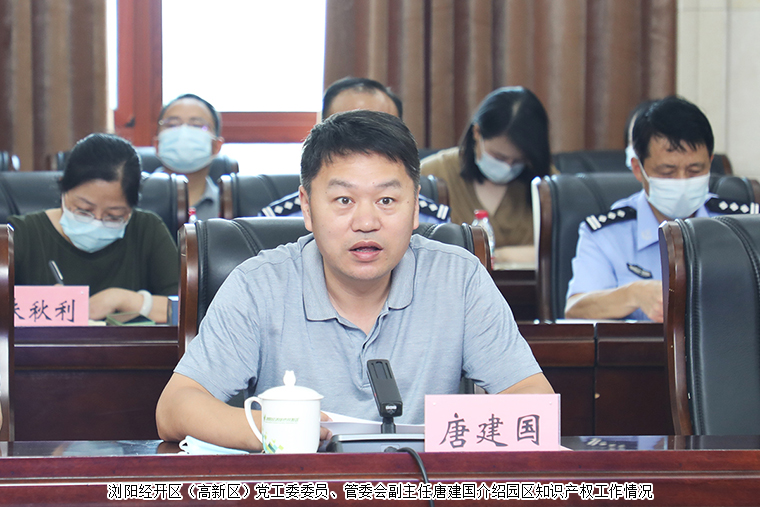 會議伊始,瀏陽經(jīng)開區(qū)(高新區(qū))黨工委委員、管委會副主任唐建國介紹園區(qū)知識產(chǎn)權(quán)工作情況。近年來,園區(qū)在省市相關(guān)部門的指導下,深入貫徹落實《知識產(chǎn)權(quán)強國建設(shè)綱要(2021-2035年)》,大力實施知識產(chǎn)權(quán)戰(zhàn)略,在完善知識產(chǎn)權(quán)管理、提升知識產(chǎn)權(quán)運用轉(zhuǎn)化、優(yōu)化知識產(chǎn)權(quán)服務(wù)、加強知識產(chǎn)權(quán)保護等方面取得了一定的成績。下一階段,園區(qū)將深入貫徹落實強省會戰(zhàn)略,按照《關(guān)于打造保護知識產(chǎn)權(quán)標桿城市支撐建設(shè)現(xiàn)代化新長沙的實施意見》等文件要求,提升知識產(chǎn)權(quán)創(chuàng)造能力,深化知識產(chǎn)權(quán)運用效益,完善知識產(chǎn)權(quán)服務(wù)供給,凝聚知識產(chǎn)權(quán)保護合力,為長沙打造保護知識產(chǎn)權(quán)標桿城市貢獻力量。