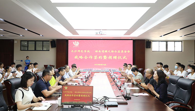 為進一步推進幼體融合、助力學(xué)前教育高質(zhì)量發(fā)展,2022年9月16日,長沙師范學(xué)院與湖南省綠之韻公益基金會戰(zhàn)略合作簽約暨捐贈儀式在長沙師范學(xué)院舉行。湖南省政協(xié)委員胡國安通過綠之韻公益基金會捐資40萬元與長沙師范學(xué)院共建湖南省幼兒體質(zhì)健康促進研究院。長沙師范學(xué)院黨委副書記、校長曹曉鮮,黨委委員、副校長黃快林,黨委委員、副校長徐慶軍,奧運冠軍、體育運動委員會專職副主任龔智超,體育科學(xué)學(xué)院院長陳捷,創(chuàng)新創(chuàng)業(yè)學(xué)院院長張德啟,教務(wù)處副處長陳亮,校友會副秘書長李月;湖南省政協(xié)委員、長沙師范學(xué)院客座教授、綠之韻集團董事長胡國安,湖南省女企業(yè)家協(xié)會常務(wù)副會長、綠之韻集團董事總裁、湖南省綠之韻公益基金會理事長勞嘉,傲迪瑪汽車董事局主席、湖南省綠之韻公益基金會副會長胡武安,湖南馬良數(shù)碼科技股份有限公司董事長周益安,湖南湘體愛動教育科技有限公司董事長張亞球,湖南馬良數(shù)碼科技股份有限公司總經(jīng)理李祥龍參加活動。