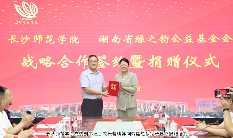 會議由長沙師范學(xué)院黨委委員、副校長黃快林主持。在觀看完宣傳片后,湖南馬良數(shù)碼科技股份有限公司董事長周益安就研究院建設(shè)總體規(guī)劃與工作目標(biāo)作了詳細介紹。隨后,長沙師范學(xué)院黨委委員、副校長徐慶軍與綠之韻集團董事總裁、湖南省綠之韻公益基金會理事長勞嘉分別代表雙方簽約。勞嘉總裁代表湖南省綠之韻公益基金會向長沙師范學(xué)院捐贈40萬元愛心支票。長沙師范學(xué)院黨委副書記、校長曹曉鮮向勞嘉總裁授予愛心捐贈證書。