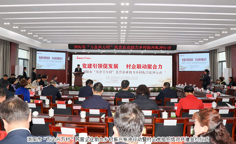 黨建引領(lǐng)促發(fā)展,村企聯(lián)動(dòng)聚合力。2023年3月23日,瀏陽(yáng)市“萬(wàn)企興萬(wàn)村”民營(yíng)企業(yè)助力鄉(xiāng)村振興棖沖行動(dòng)暨村企黨組織結(jié)對(duì)共建簽約儀式在瀏陽(yáng)市棖沖鎮(zhèn)舉行。中共瀏陽(yáng)市委副書(shū)記、統(tǒng)戰(zhàn)部部長(zhǎng)戴武明,中共瀏陽(yáng)市委常委、組織部部長(zhǎng)唐安石,中共瀏陽(yáng)市委常委、市委辦主任王坤球,瀏陽(yáng)市人大常委會(huì)黨組成員、副主任唐洪勝,瀏陽(yáng)市人民政府副市長(zhǎng)劉來(lái)宏,瀏陽(yáng)市政協(xié)副主席、市工商聯(lián)主席陳靜等領(lǐng)導(dǎo)出席活動(dòng)。瀏陽(yáng)市相關(guān)單位和部門(mén)負(fù)責(zé)人,棖沖鎮(zhèn)全體黨政領(lǐng)導(dǎo),村黨總支書(shū)記、主任,鄉(xiāng)村振興駐村第一書(shū)記以及結(jié)對(duì)幫扶企業(yè)代表參加活動(dòng)。綠之韻集團(tuán)黨委書(shū)記劉云代表公司受邀參加活動(dòng)。