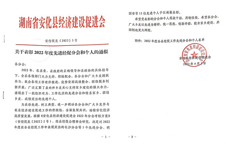 大會(huì)由安化縣政協(xié)黨組書記、主席胡能華主持。中共安化縣委常委、常務(wù)副縣長(zhǎng)謝可贊宣讀《關(guān)于“迎老鄉(xiāng)回故鄉(xiāng)建家鄉(xiāng)”突出貢獻(xiàn)先進(jìn)個(gè)人的通報(bào)》《關(guān)于表彰 2022 年度先進(jìn)分會(huì)和個(gè)人的通報(bào)》。與會(huì)領(lǐng)導(dǎo)為獲獎(jiǎng)的先進(jìn)單位及個(gè)人頒獎(jiǎng)。憑借著在過去一年中在全縣經(jīng)促工作中的突出表現(xiàn),胡國(guó)安會(huì)長(zhǎng)被評(píng)為“2022年度全縣經(jīng)促工作先進(jìn)個(gè)人”,長(zhǎng)沙市安化商會(huì)被評(píng)為“2022年度全縣經(jīng)促工作先進(jìn)分會(huì)”。