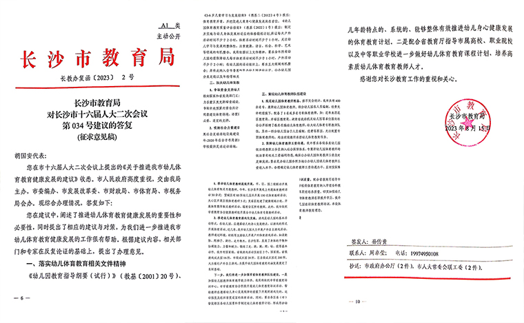 幼兒健康不僅關(guān)系到國民體質(zhì)健康和人的全面發(fā)展,更是關(guān)系到整個(gè)家庭的幸福。胡國安代表自提出《關(guān)于推進(jìn)我市幼兒體育教育健康發(fā)展》的建議以來,多次親自率領(lǐng)團(tuán)隊(duì)深入長沙師范學(xué)院就學(xué)前體育教師教育和幼兒體育事業(yè)發(fā)展進(jìn)行調(diào)查研究。2022年9月16日,胡國安代表通過綠之韻公益基金會(huì)捐資40萬元與長沙師范學(xué)院共建湖南省幼兒體質(zhì)健康促進(jìn)研究院,助力省市幼兒體質(zhì)健康促進(jìn)事業(yè)發(fā)展。