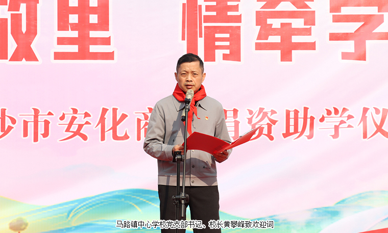 活動伊始,少先隊員們?yōu)榈綀黾钨e佩戴紅領(lǐng)巾,行隊禮,用行動向愛心企業(yè)和人士表達誠摯的感謝。愛心捐贈儀式上,馬路鎮(zhèn)中心學校黨支部書記、校長黃攀峰在致辭中感謝了長沙市安化商會以綠之韻為代表的諸多愛心企業(yè)與愛心志愿者們對學校及孩子們的關(guān)愛與幫助。隨后,長沙市安化商會會長、綠之韻集團董事長胡國安與長沙市安化商會黨支部書記、執(zhí)行會長吳余生向馬路鎮(zhèn)蒼場完小、東坪完小捐贈50萬元的現(xiàn)金支票。安化縣政協(xié)副主席、工商聯(lián)主席劉暢術(shù),安化縣教育局黨組書記、局長陳羽成為愛心企業(yè)頒發(fā)捐贈證書。