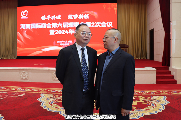 2025年1月21日,湖南國際商會第六屆理事會第2次會議暨2024年會在長沙召開。湖南省貿(mào)促會黨組書記、會長 、湖南國際商會會長楊愛云,湖南省貿(mào)促會黨組成員、副會長、湖南國際商會副會長傅丹舟,湖南省貿(mào)促會黨組成員、副會長羅專等領導出席會議。湖南省貿(mào)促會黨組成員、副會長、湖南國際商會副會長鄧羅興主持會議。中國國際商會湖南商會副會長、湖南省慈善總會副會長、綠之韻集團董事長胡國安受邀出席會議。