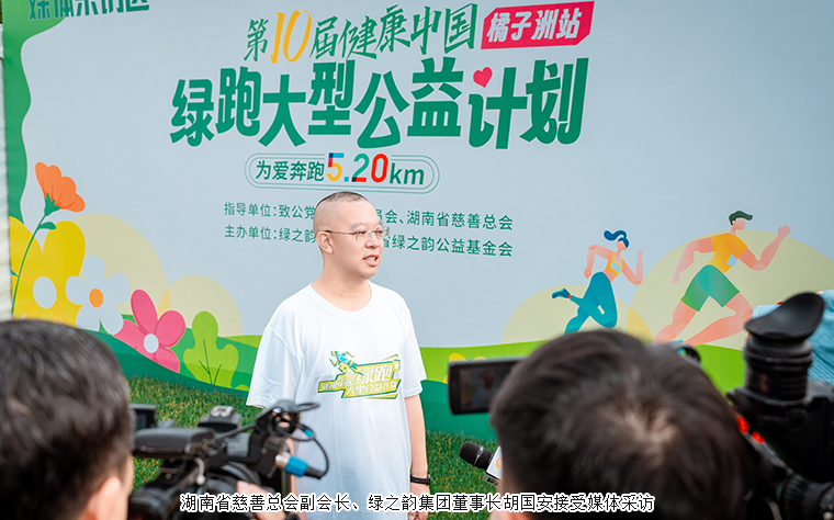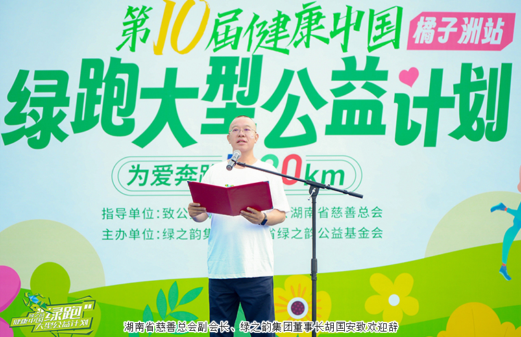 湖南省慈善總會副會長、綠之韻集團董事長胡國安致歡迎辭。他首先代表綠之韻集團及公益基金會,向蒞臨本次活動的領導嘉賓、媒體朋友、跑步愛好者,以及來自全國各地的家人們致以最熱烈的歡迎;向10年來風雨同路的5.20公里踐行者,向所有投身公益的愛心企業(yè)、市民朋友,致以崇高的敬意和誠摯的感謝。他表示,今年公益綠跑的主題是“10放活力 益起上場”。“10”既是綠跑舉辦10屆的里程碑,更是綠之韻公益基金會成立10周年的見證。2023年,綠之韻投入1000萬元啟動了“圓夢行動”公益項目。本屆綠跑,我們將繼續(xù)推進“圓夢行動”公益項目,與湖南省慈善總會、芒果TV芒果公益平臺、長沙市彩虹殘疾人士服務中心、瀏陽市、安化縣等地多個單位簽訂圓夢結對幫扶協(xié)議,去幫助更多需要幫助的人。他祝愿,每一位綠跑選手都能取得好成績,愿今天的湘江碧波見證更多公益火種的播撒,愿我們攜手邁向更加健康、美好的明天!