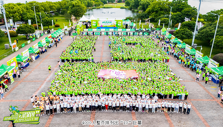 活動現(xiàn)場,4000多名綠跑選手在橘子洲噴泉廣場有序排列出“10”字巨幕造型,伴隨著歡呼聲和響徹云霄的“‘10’放活力,‘益’起上場”,航拍鏡頭下宛如躍動的綠色脈搏,致敬著十年公益長河中的每一簇浪花。這是獨屬綠跑的浪漫和恢弘,激勵我們涌愛向前,“益”起奔赴美好。