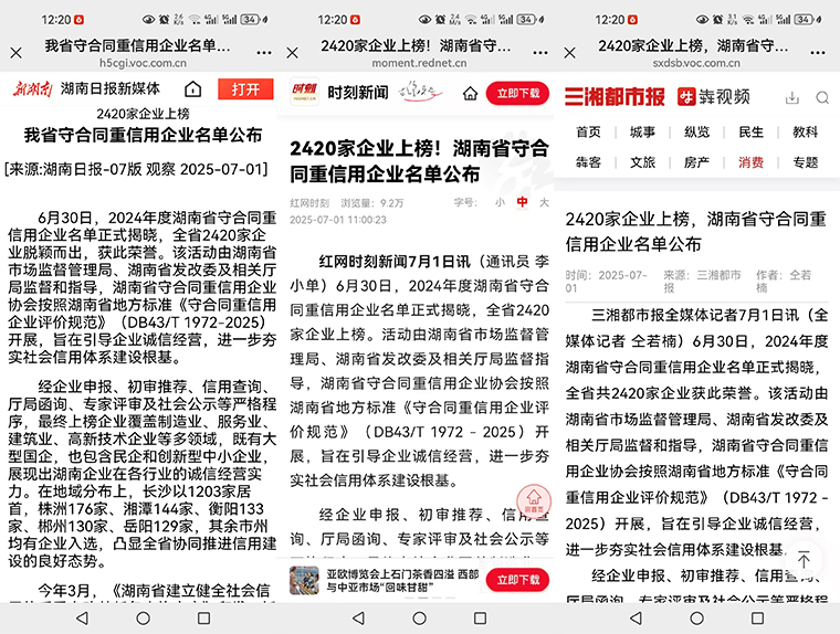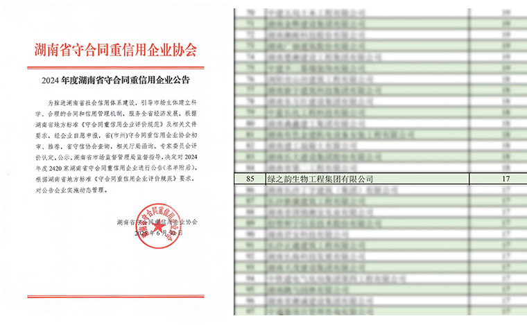 2025年6月,2024年度湖南省守合同重信用企業(yè)名單正式發(fā)布,新湖南、紅網(wǎng)、三湘都市報(bào)等相繼進(jìn)行了公示報(bào)道。綠之韻集團(tuán)憑借深入踐行的誠信理念、完善的合同信用管理體系和卓越的綜合管理水平,連續(xù)第十七年蟬聯(lián)“湖南省守合同重信用企業(yè)”與“長(zhǎng)沙市守合同重信用企業(yè)”稱號(hào)。這份跨越十七載的持續(xù)認(rèn)可,有力印證了綠之韻將誠信視為企業(yè)生命線、融入發(fā)展血脈的長(zhǎng)期堅(jiān)守。