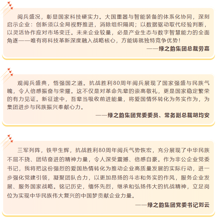 致敬偉大勝利,汲取奮進(jìn)力量。綠之韻集團(tuán)董事長胡國安在觀看閱兵儀式后表示,閱兵儀式展現(xiàn)的大國風(fēng)范和民族精神,正是綠之韻22年來砥礪前行的力量源泉。站在歷史與未來的交匯點(diǎn),我們要更加深刻認(rèn)識到企業(yè)發(fā)展與國家命運(yùn)息息相關(guān)。觀看閱兵儀式是一次深刻的愛國主義教育和精神洗禮,抗戰(zhàn)精神是企業(yè)發(fā)展不可或缺的精神財(cái)富。通過此次觀閱活動,希望全體綠之韻人要進(jìn)一步汲取歷史智慧、錘煉政治品格,將閱兵儀式所展現(xiàn)的團(tuán)結(jié)奮進(jìn)、自強(qiáng)不息的精神轉(zhuǎn)化為推動企業(yè)創(chuàng)新發(fā)展的實(shí)際行動。未來,綠之韻集團(tuán)將繼續(xù)深化黨建與企業(yè)發(fā)展同頻共振,引領(lǐng)公司在新時代征程中踐行社會責(zé)任、展現(xiàn)企業(yè)擔(dān)當(dāng),為實(shí)現(xiàn)中華民族偉大復(fù)興貢獻(xiàn)力量。