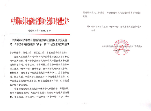 瀏陽市委兩新工委在全市兩新黨組織中組織開展“兩爭一創(chuàng)”行動先進(jìn)典型評選,旨在深入貫徹落實新時代中國特色社會主義思想和黨的十九大精神,彰顯兩新黨組織戰(zhàn)斗堡壘作用和黨員先鋒模范作用。湖南綠之韻保健日用品有限公司黨支部憑借出色的黨建工作,經(jīng)基層推薦、差額比選、組織考察、綜合會審,并經(jīng)市委兩新工委會議研究,被評為瀏陽市兩新黨組織“兩爭一創(chuàng)”行動“先進(jìn)基層黨組織創(chuàng)建單位”,中共瀏陽市委常委、組織部部長周文舜給獲獎的先進(jìn)集體頒獎。