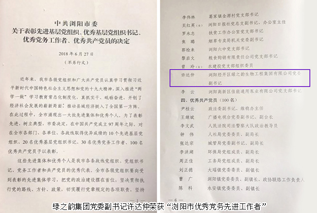 2018年6月29日,瀏陽(yáng)經(jīng)開區(qū)慶祝中國(guó)共產(chǎn)黨建黨97周年暨“黨建示范點(diǎn) 優(yōu)秀共產(chǎn)黨員”表彰活動(dòng)在園區(qū)金陽(yáng)文化藝術(shù)中心舉行。長(zhǎng)沙市委組織部副部長(zhǎng)、長(zhǎng)沙市兩新工委書記、長(zhǎng)沙市績(jī)效辦主任易敏華,長(zhǎng)沙市兩新工委辦公室主任楊立志;瀏陽(yáng)經(jīng)開區(qū)黨工委書記郭力夫,瀏陽(yáng)經(jīng)開區(qū)黨工委副書記、管委會(huì)主任談文昌等領(lǐng)導(dǎo)參加會(huì)議。綠之韻集團(tuán)黨委書記劉云帶領(lǐng)集團(tuán)優(yōu)秀黨員和2018年度新發(fā)展的預(yù)備黨員參加會(huì)議。會(huì)上,綠之韻集團(tuán)保健日用品支部憑借出色的黨建工作被評(píng)為“黨建示范點(diǎn)”。綠之韻集團(tuán)黨委副書記許達(dá)仲榮獲“瀏陽(yáng)市優(yōu)秀黨務(wù)先進(jìn)工作者”。