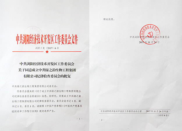 2017年12月19日,中共綠之韻生物工程集團(tuán)有限公司紀(jì)律檢查委員會(huì)成立暨第一屆委員選舉大會(huì)成功召開。會(huì)上,根據(jù)中共瀏陽(yáng)經(jīng)濟(jì)技術(shù)開發(fā)區(qū)工作委員會(huì)[2017]6號(hào)文件批復(fù),中共綠之韻生物工程集團(tuán)有限公司紀(jì)律檢查委員會(huì)正式成立。會(huì)上選舉并產(chǎn)生了第一屆紀(jì)委班子。綠之韻集團(tuán)常務(wù)副總經(jīng)理胡均安,副總經(jīng)理梅其慧,黨委書記劉云、副書記許達(dá)仲攜各黨支部書記、全體黨員參加會(huì)議。本次大會(huì)還特別邀請(qǐng)了瀏陽(yáng)經(jīng)開區(qū)黨群工作局科長(zhǎng)李慶參加會(huì)議。